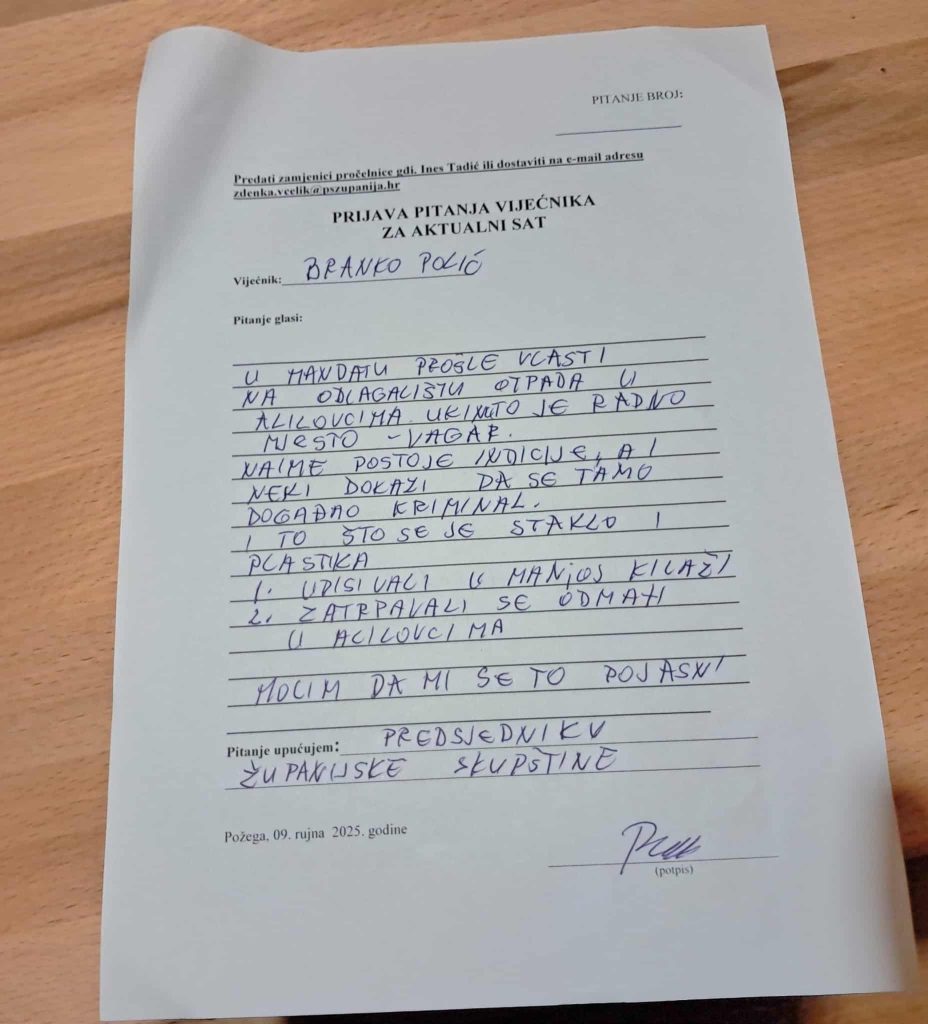 “Na sjednici sam postavio pitanje i iznio indicije da se u Komunalcu dešavaju nekakve nezakonite radnje sa smećem. Predsjednik Županijske skupštine Ferdinand Troha odgovorio mi je da to nije stvar županije, no smatram da jest, jer Komunalac Požega i odlagalište u Alilovcima služe građanima cijele Požeštine — Pleternice, Kutjeva, Jakšića, Čaglina, Brestovca, Velike i Kaptola. Istraga je u tijeku, i smatram da se iza otpada, poglavito stakla i plastike, nazire veliki kriminal,” izjavio je Polić.