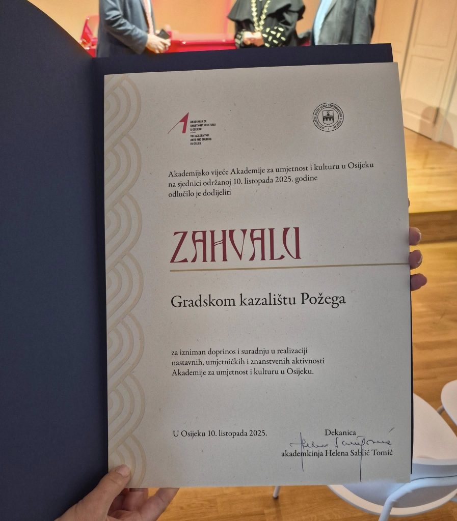 U ime Gradskog kazališta Požega svečanosti je nazočila ravnateljica prof. Valentina Neferović, koja je tom prilikom primila zahvalu dekanice akademkinje Helene Sablić Tomić, za dugogodišnju uspješnu suradnju između kazališta i Akademije.