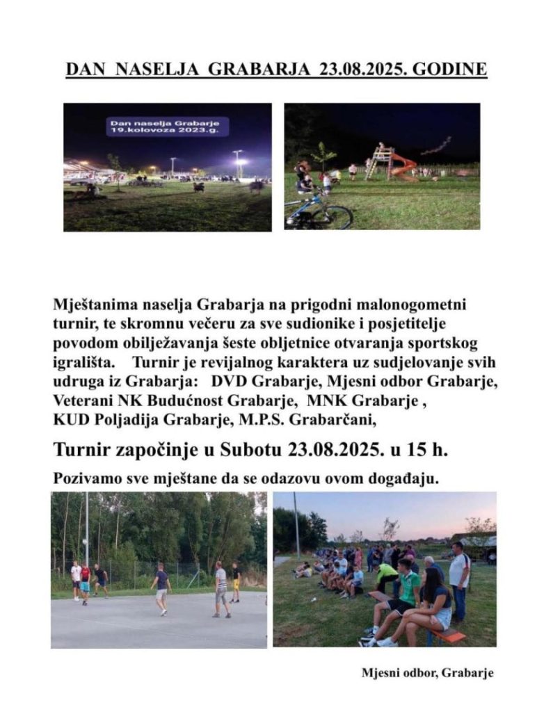 Grabarje će u subotu, 23. kolovoza 2025. s početkom u 15 sati, biti mjesto sporta, druženja i zajedništva povodom obilježavanja šeste obljetnice otvaranja sportskog igrališta – prenosi Kutjevački.hr