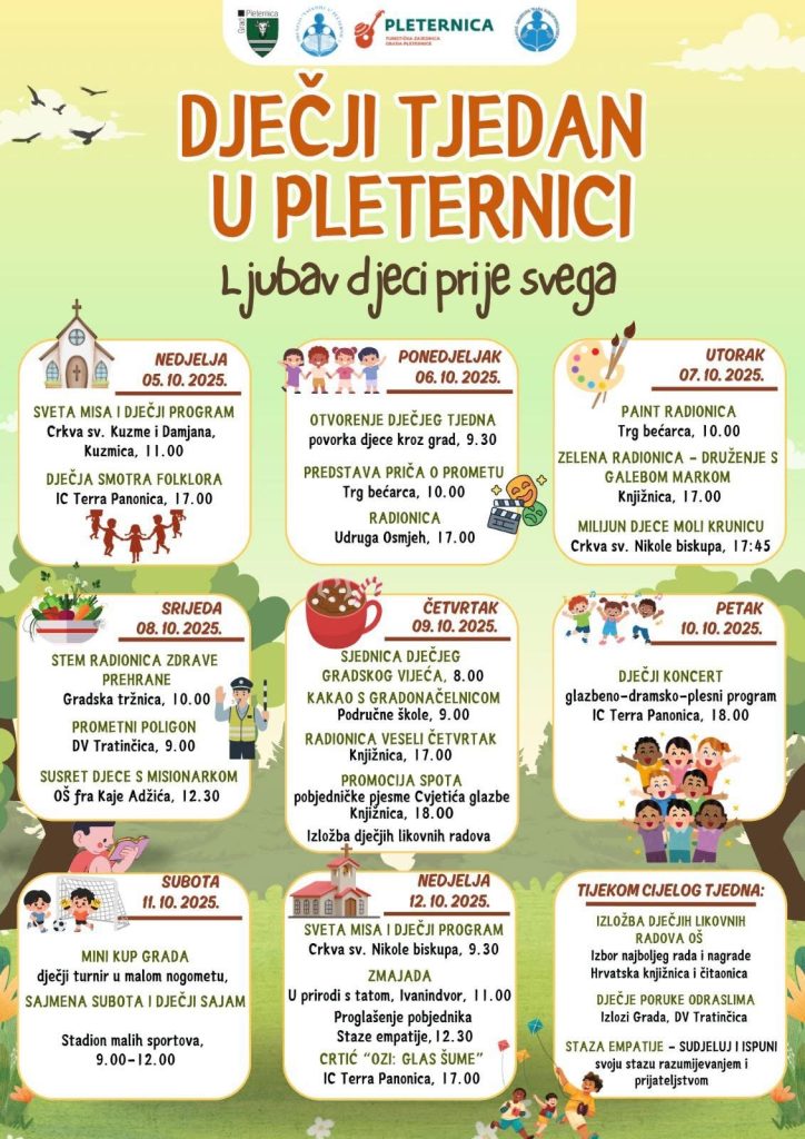 Tijekom cijelog tjedna Pleternicu će ispuniti dječji glasovi – od radionica, predstava i sportskih igara, do zajedničkih druženja i kreativnih izložbi. Svaki će dan donijeti novu priliku da se mališani izraze i pokažu koliko svijet može biti ljepši kad se gleda dječjim očima.