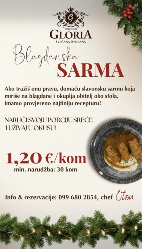 Požega – Uoči predstojećih blagdana, dvorana Gloria u Požegi lansirala je posebnu gastronomsku ponudu namijenjenu većim obiteljskim ili korporativnim okupljanjima: domaću slavonsku sarmu po cijeni od 1,20 € po komadu, uz minimalnu narudžbu od 30 komada.