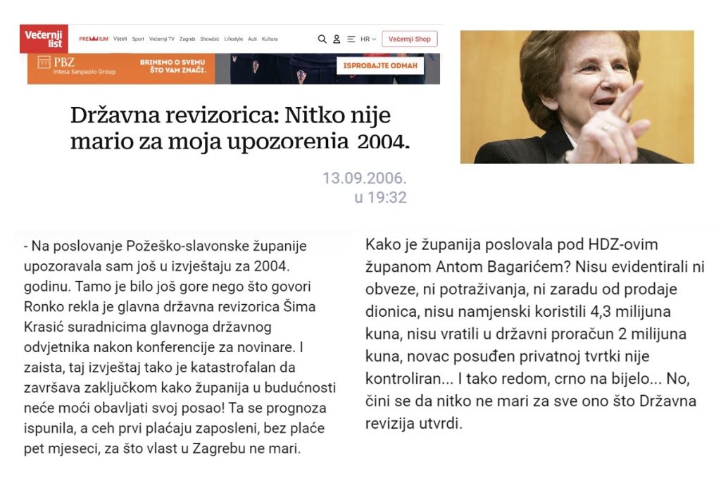Umrla je Šima Krasić, prva Državna revizorica u RH koja je tu dužnost obavljala 16 godina (1994-2010).Godine 2006. kad sam preuzeo upravljanje razorenom požeško-slavonskom županijom ostala je zapisana njena izjava u Hrvatskom saboru: „Stanje je bilo još gore nego što govori Ronko.“